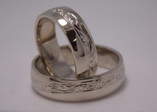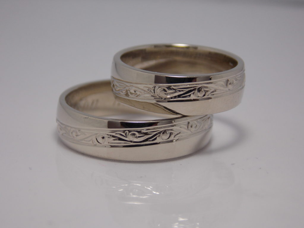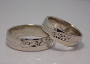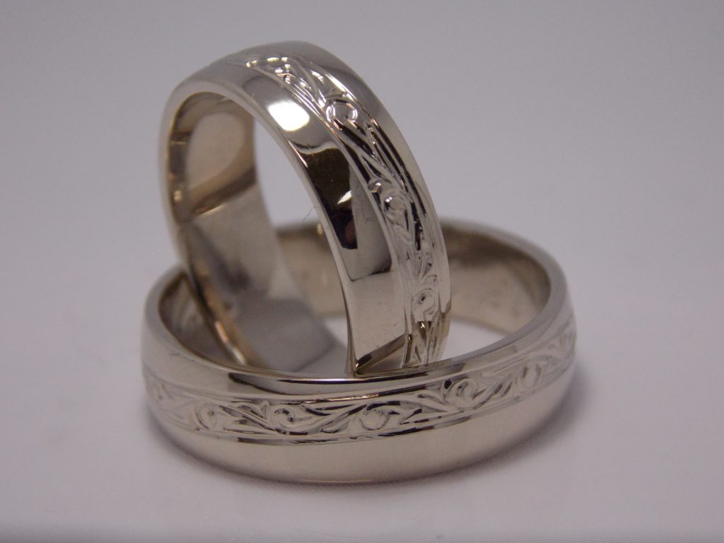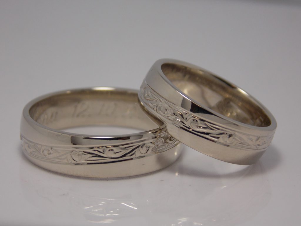 Svadobné obrúčky Afrodite sú vyrobené zo 14kt bieleho zlata. Biele zlato je v originálnej farbe – samozrejme podľa požiadaviek zákazníka je možné svadobné obrúčky porhodiovať – teda pobieliť. Po celom obvode svadobných obrúčiek je stredom gravírovný vzor. Je možnosť prispôsobiť farbu zlata a šírku svadobných obrúčiek podľa Vašich požiadaviek.