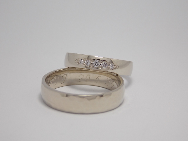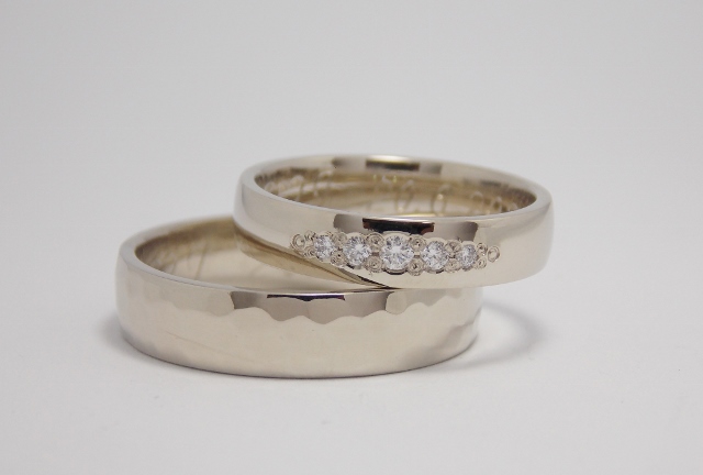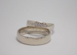 Svadobné obrúčky Aurora sú vyrobené z čistého bieleho 14kt zlata. Biele zlato je vo svojej originálnej farbe. Je možné ho dodatočne porhódiovať. Dámska obrúčka je zdobená diamantmi. Pánska je zdobená vzorom tisíc-hran. Obrúčky sú vďaka tomu jedinečné, stále pôsobia jemne a elegantne. Jemne oblý profil zaručuje komfortné nosenie.