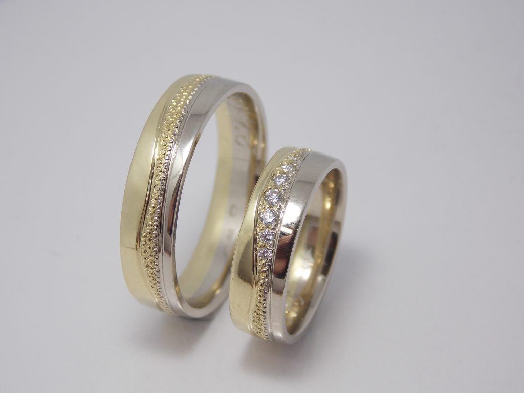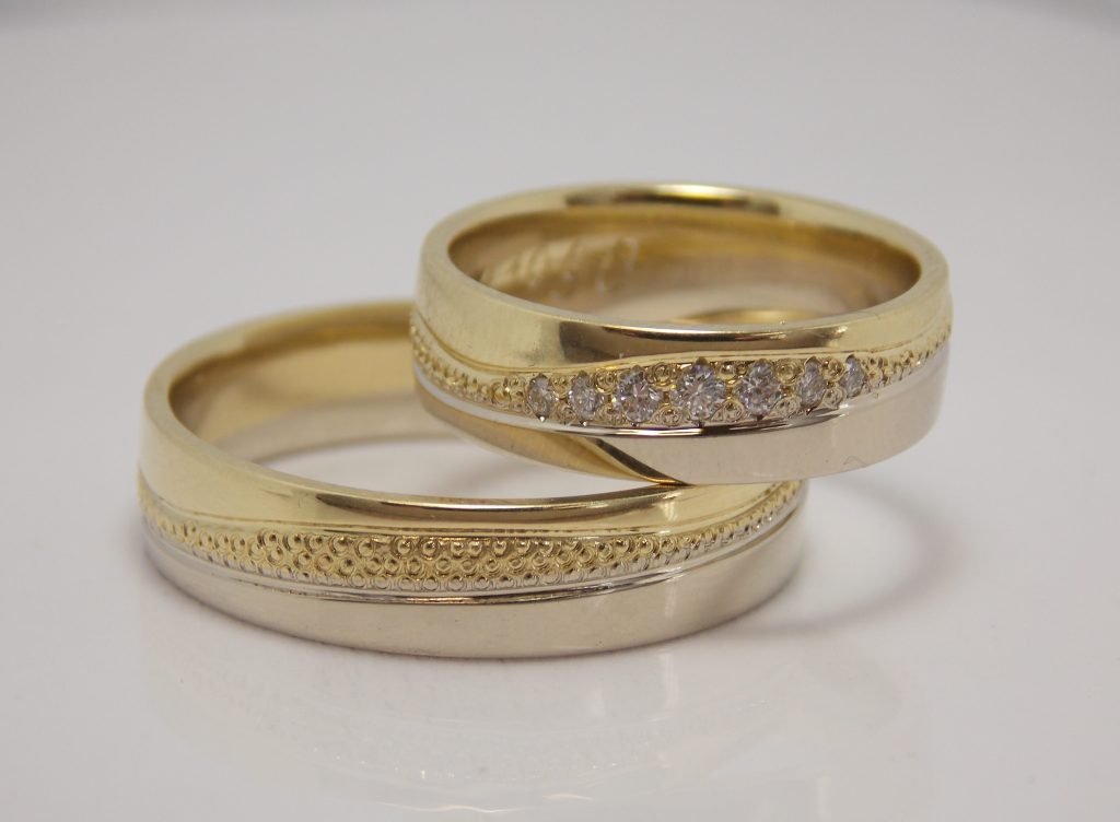 Svadobné obrúčky Charming sú vyrobené zo žltého a bieleho 14kt zlata. Farby zlata sú oddelené jemnou guličkovým vzorom v tvare vlnky po celom obvode. V dámskej obrúčke sú do tohto vzoru naviac osadené diamanty. Svadobné obrúčky sú v lesklom prevedení.