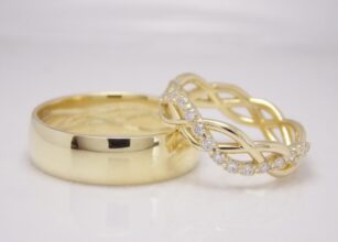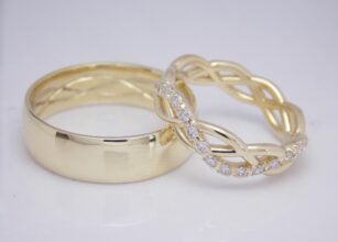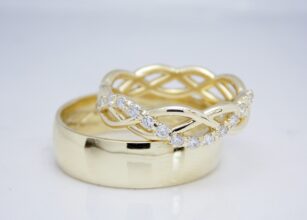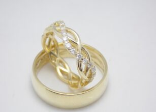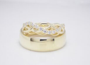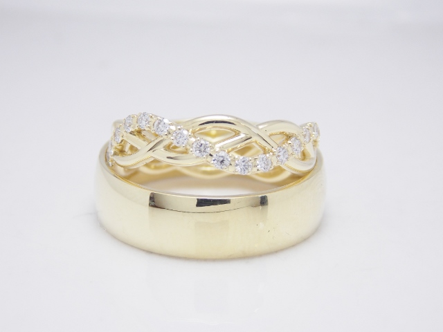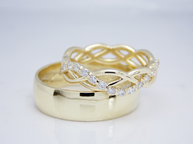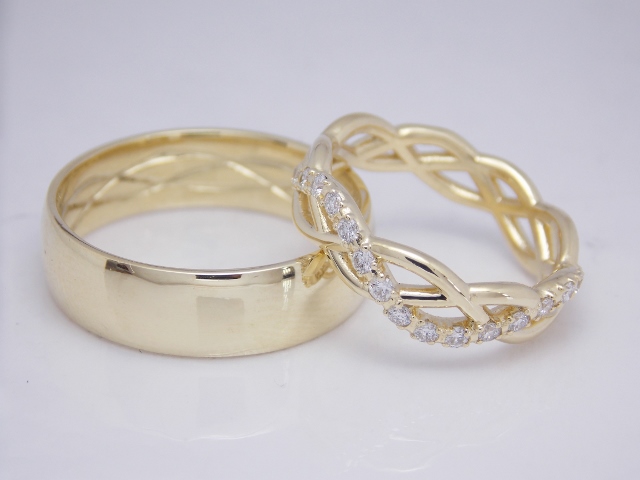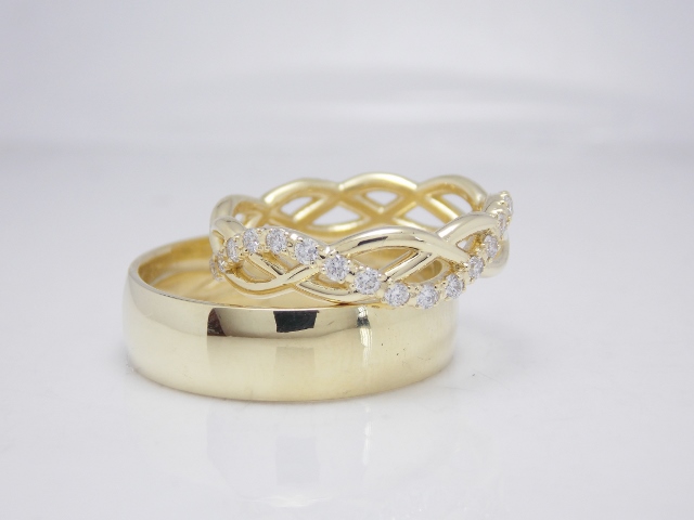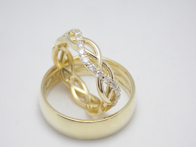 Svadobné obrúčky Infinity sú vyrobené zo žltého 14kt zlata. Pánska obrúčka je jednoduchá, tradičná a elegantná. Dámska je tvorená prepleteným vzorom. Jedna línia dámskej obrúčky je zdobená kvalitne osadenými diamantmi. Je netradičná a zároveň pôsobí elegantne.