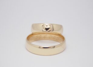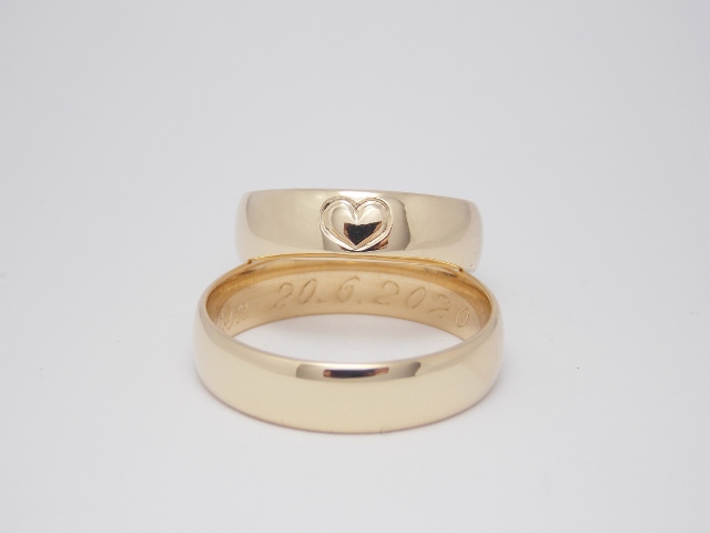 Svadobné obrúčky Soul sú vyrobené zo žltého 14kt zlata. Obrúčky majú lesklý povrch a dámska obrúčka je obohatená o vygravírované srdce v strede obrúčky. Ich jemne oblý profil zaručuje komfort pri nosení.