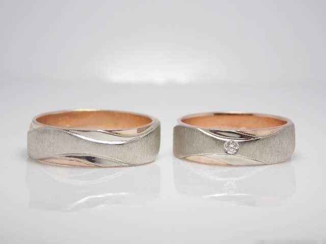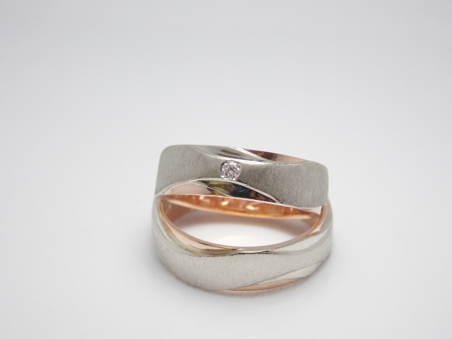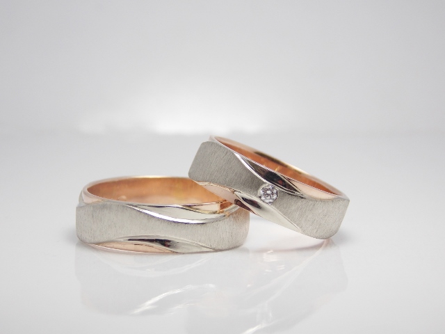 Svadobné obrúčky Twosome sú vyrobené z bieleho a červeného 14kt zlata. Obe obrúčky sú zdobené matnými, lesklými drážkami a vnútrom z červeného zlata. Dámska je obohatená o kvalitne osadený diamant. Jemne oblý profil zaručuje komfort pri nosení.