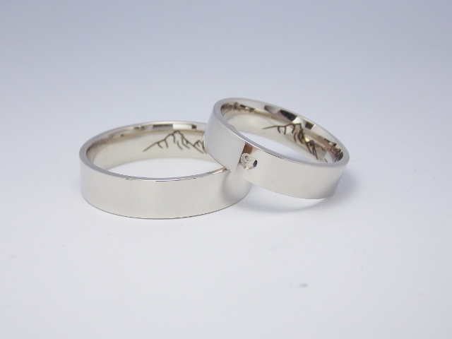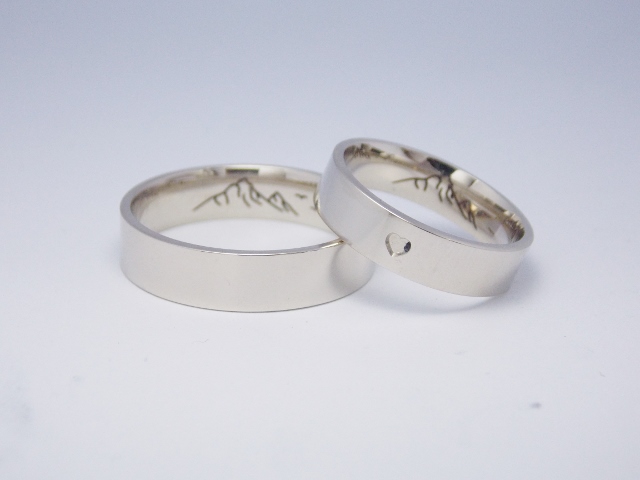 Svadobné obrúčky Unity sú vyrobené z bieleho 14kt zlata, ktoré je rhódiované (pobielené). Dámska obrúčka je zdobená vyrytým srdcom v strede. Obe obrúčky majú plochý profil a šírku 5 mm. Vnútro je vygravírované podľa želania zákazníka. Zákazník má možnosť meniť farbu zlata, šírku obrúčok, vonkajší profil prevedenia ako aj povrchovú úpravu.